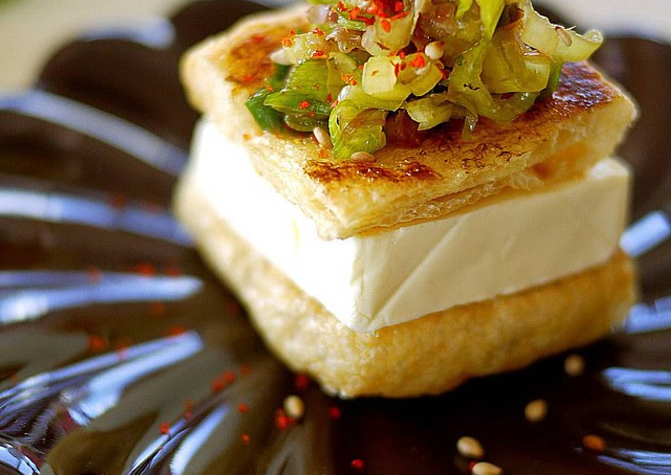- Sandwich the cream cheese between two pieces of aburaage. Cut into triangles or leave as squares.