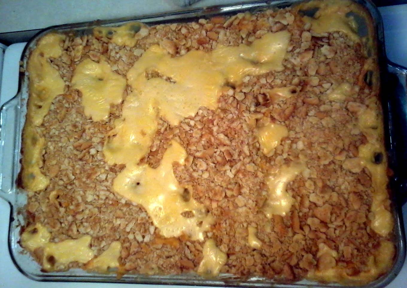 - stir, lay in glass pan, sprinkle nd cover with cheese. crush nd cover with crackers.