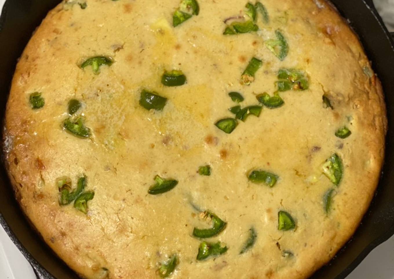 - Remove cast iron skillet from oven. Using a silicone brush, brush pan entirely with some of remaining butter. Pour in batter and give a few vigorous shakes. Don’t forget to utilize your oven mitts. Top with remaining jalapeño peppers. Bake for roughly 25 minutes.
