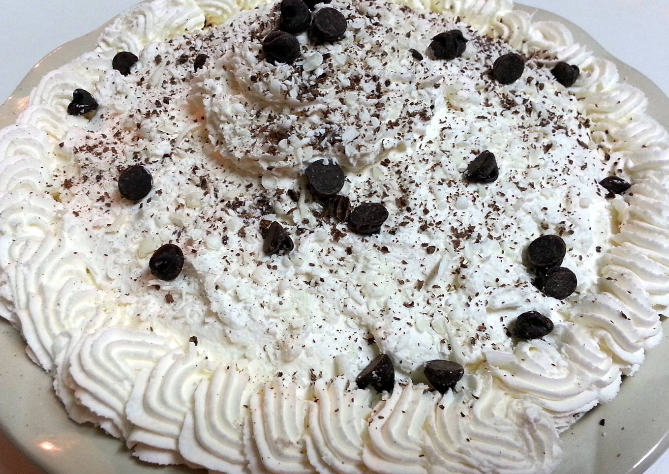 - Whipped Topping: In a large bowl, whisk confectioners sugar, vanilla, and whipping cream until stiff peaks form; spread on top of filling, forming a dome. Add chocolate sprinkles to top. Keep refrigerated until ready to serve.