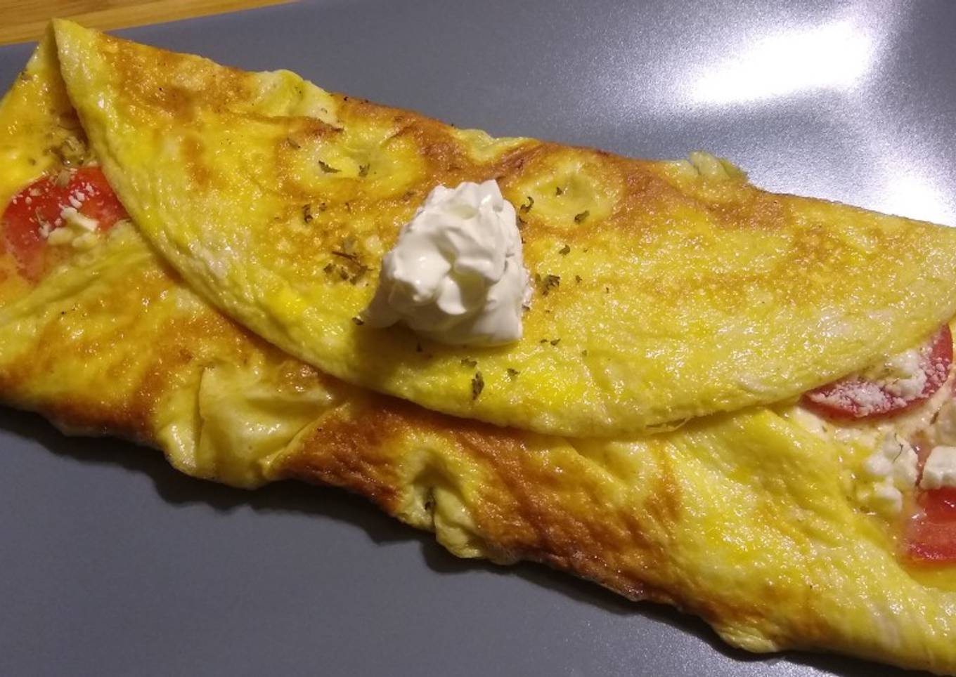 - In a mixing bowl whisk eggs until blended. Heat oil in pan and pour in eggs. Once eggs are almost cooked add tomatoes, feta, salt, and oregano. Fold sides in. Serve with sour cream.