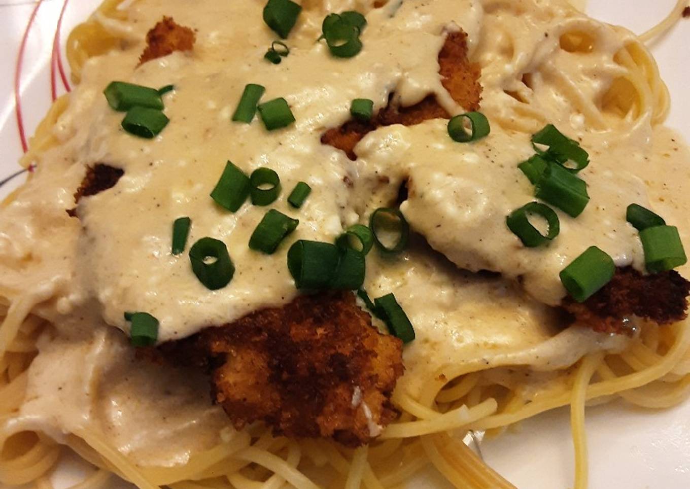 - Pour over chicken and serve. We like it served over spaghetti, garnished with chives or minced green onions.