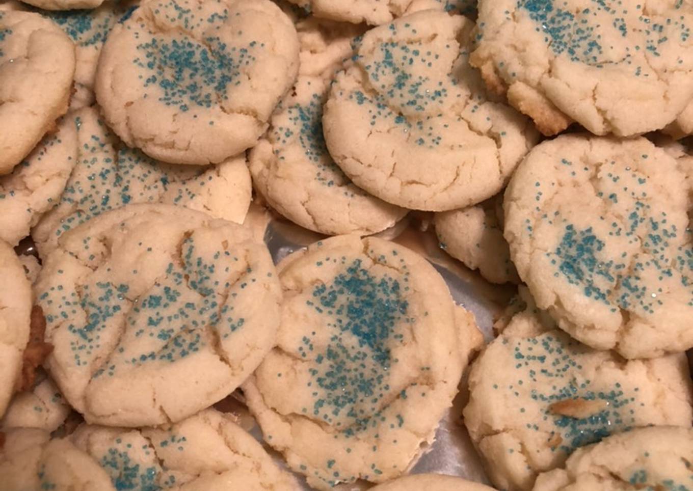 - On parchment lined pan drop cookies and bake about 8 minutes. I added colored sugar sprinkles before I baked them. I use a cookie scoop. Bake only until the bottoms turn slightly brown. Transfer to a cooling rack.