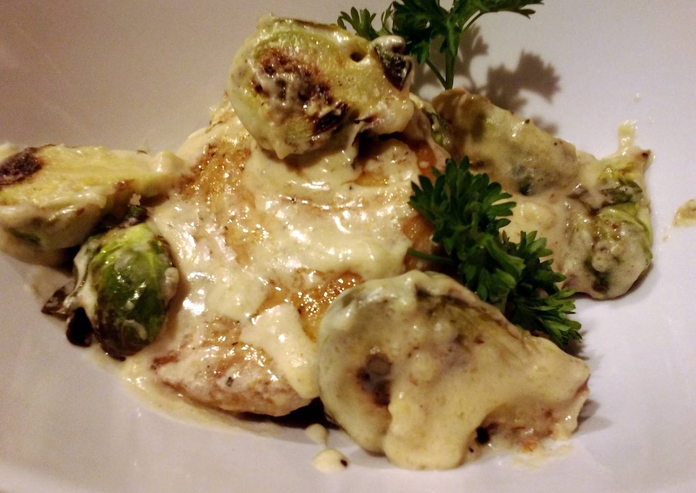 Sauteed pork and brussels sprouts in cream sauce