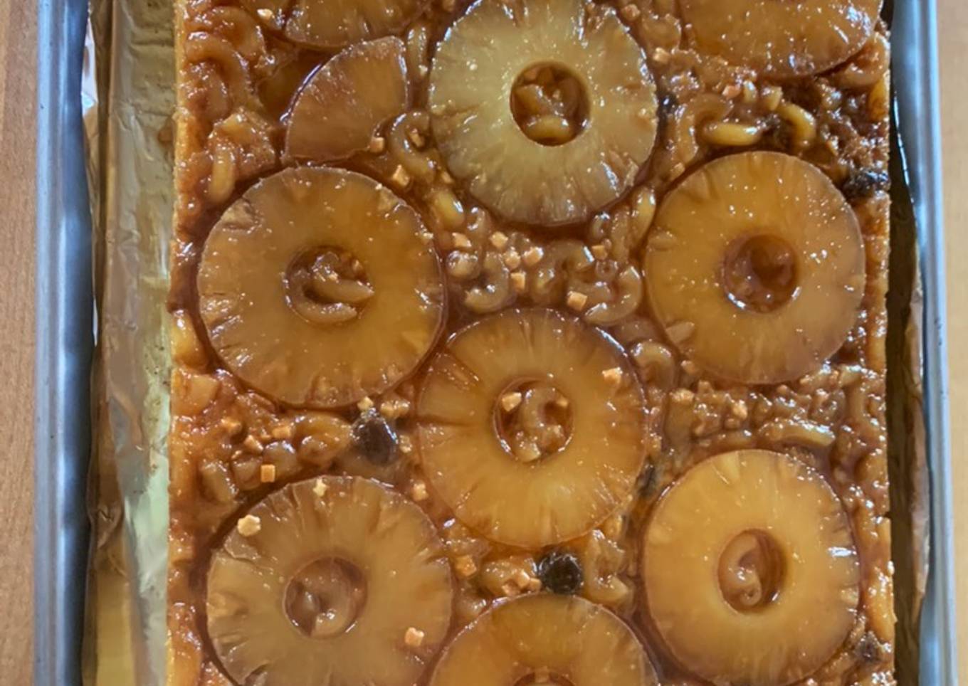 - Pour noodle mixture over prepared pan of pineapple. Bake for one hour.