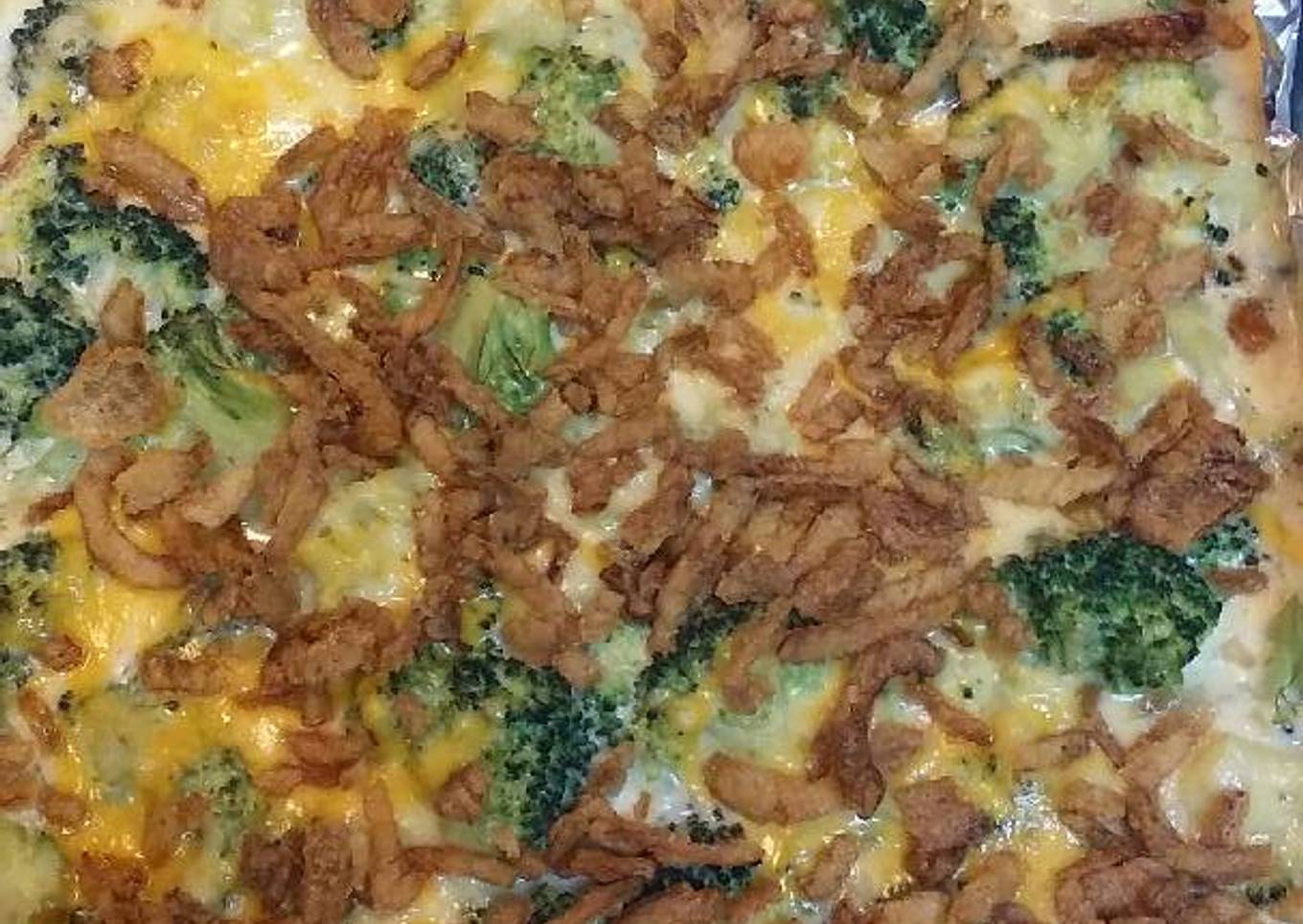 - Toss the broccoli and cheese sauce together in the bowl, then transfer it to the prepared baking pan. Sprinkle the additional cheese over the top, then the crushed up French onions.