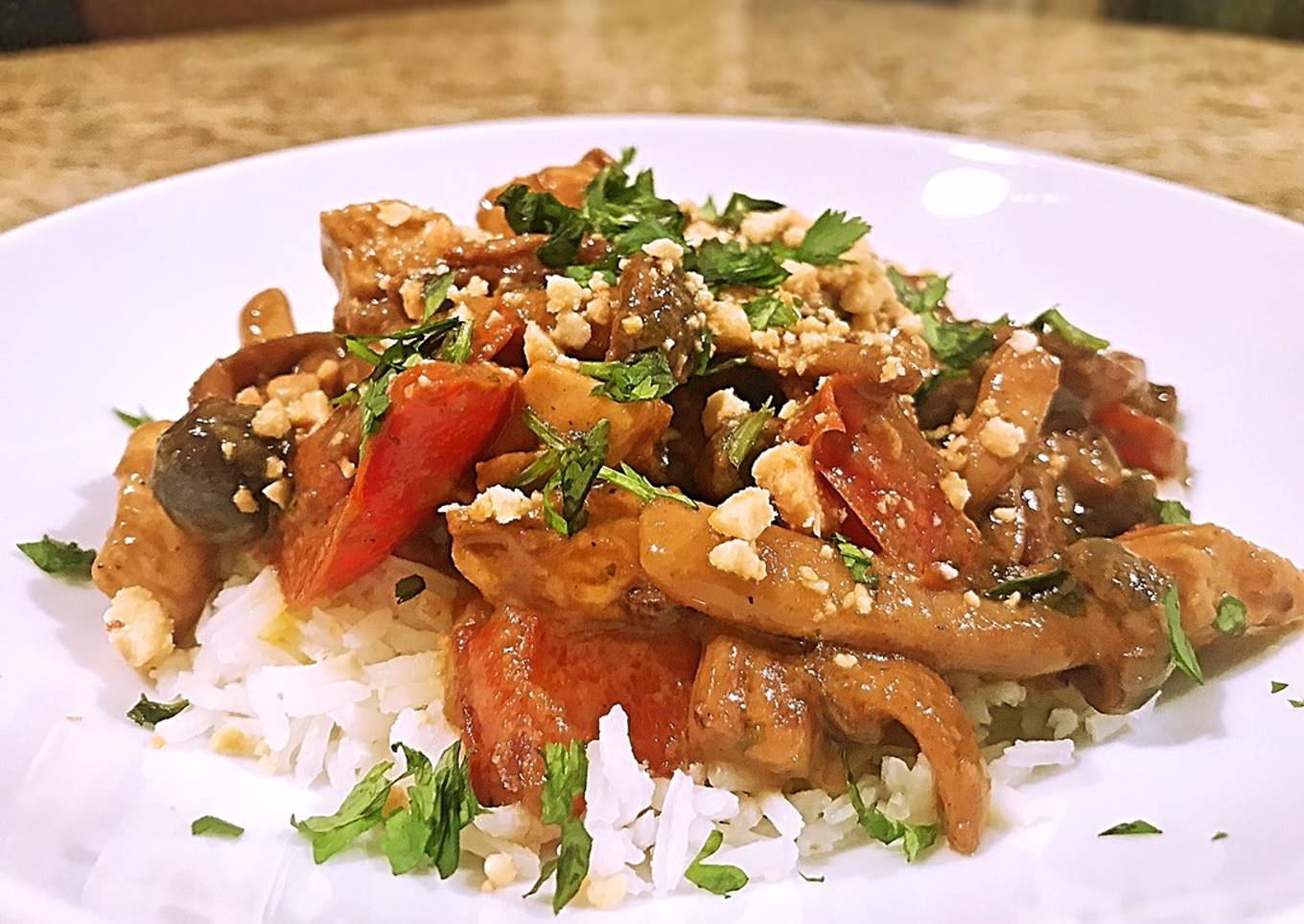 - Serve over white rice and finish with cilantro and chopped peanuts.