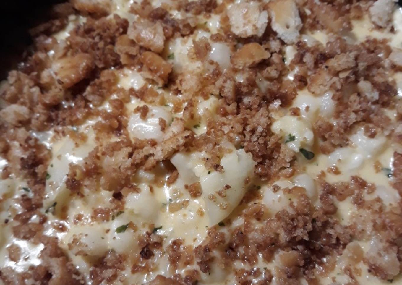 - Pour the hominy, parsley, and cheese sauce over the cauliflower.