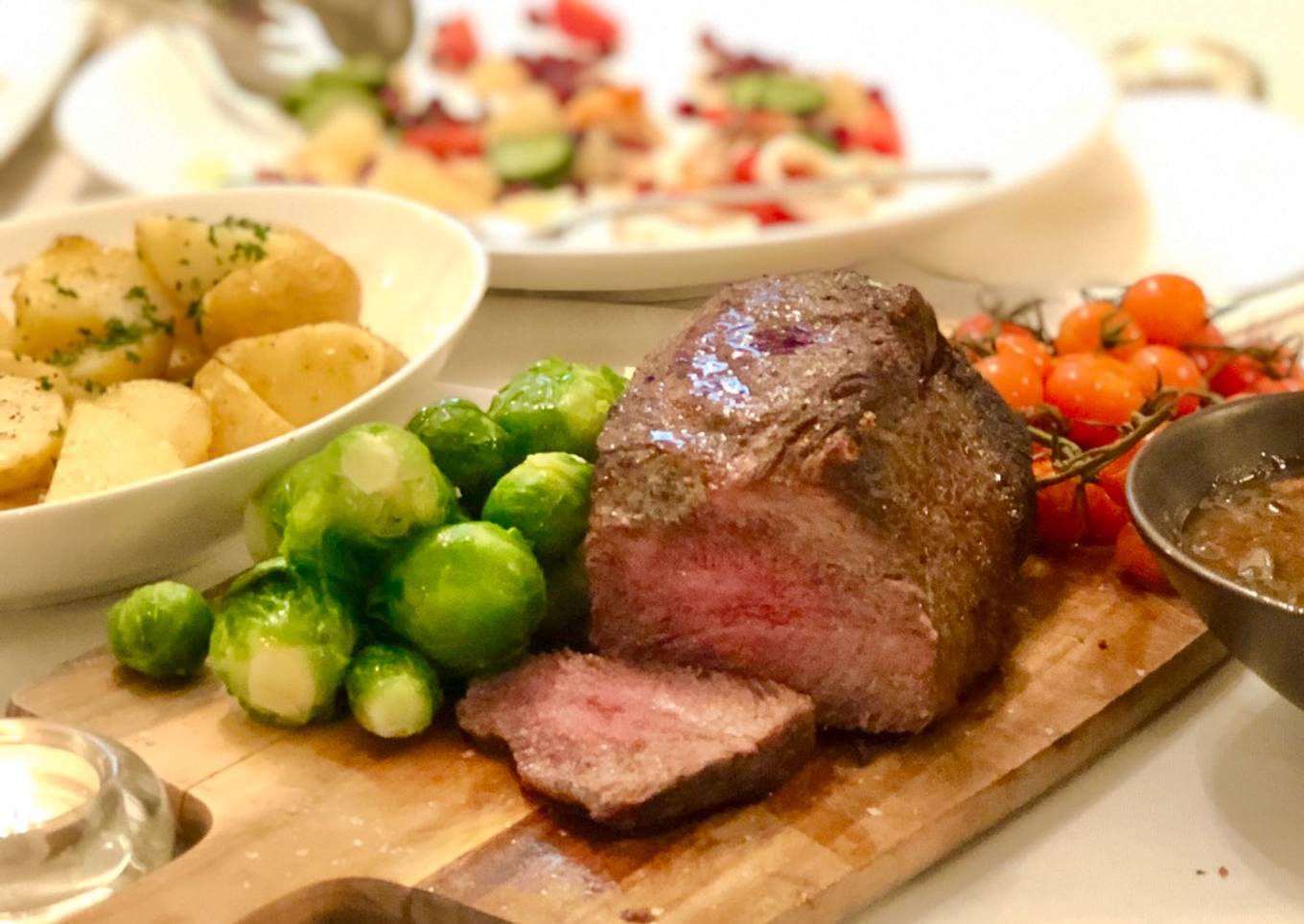 - Trim the beef (if needed), dry it with kitchen towel, marinate with olive oil, rosemary, garlic and pepper for an hour