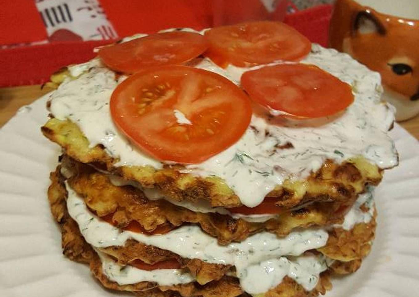 - Layer out all the prepared ingredients. First layer the zucchini pancake then spread the sour cream mix and cut tomatoes on top. Repeat!