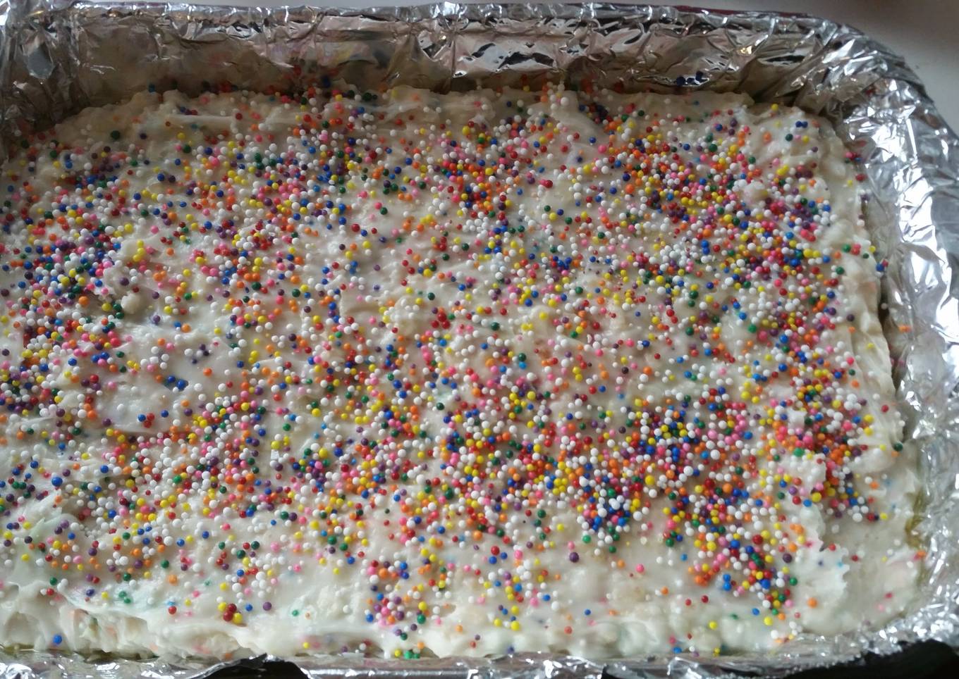 - Spread mixture into the pan (topping with more sprinkles if desired) and throw it in the fridge until cool and set!