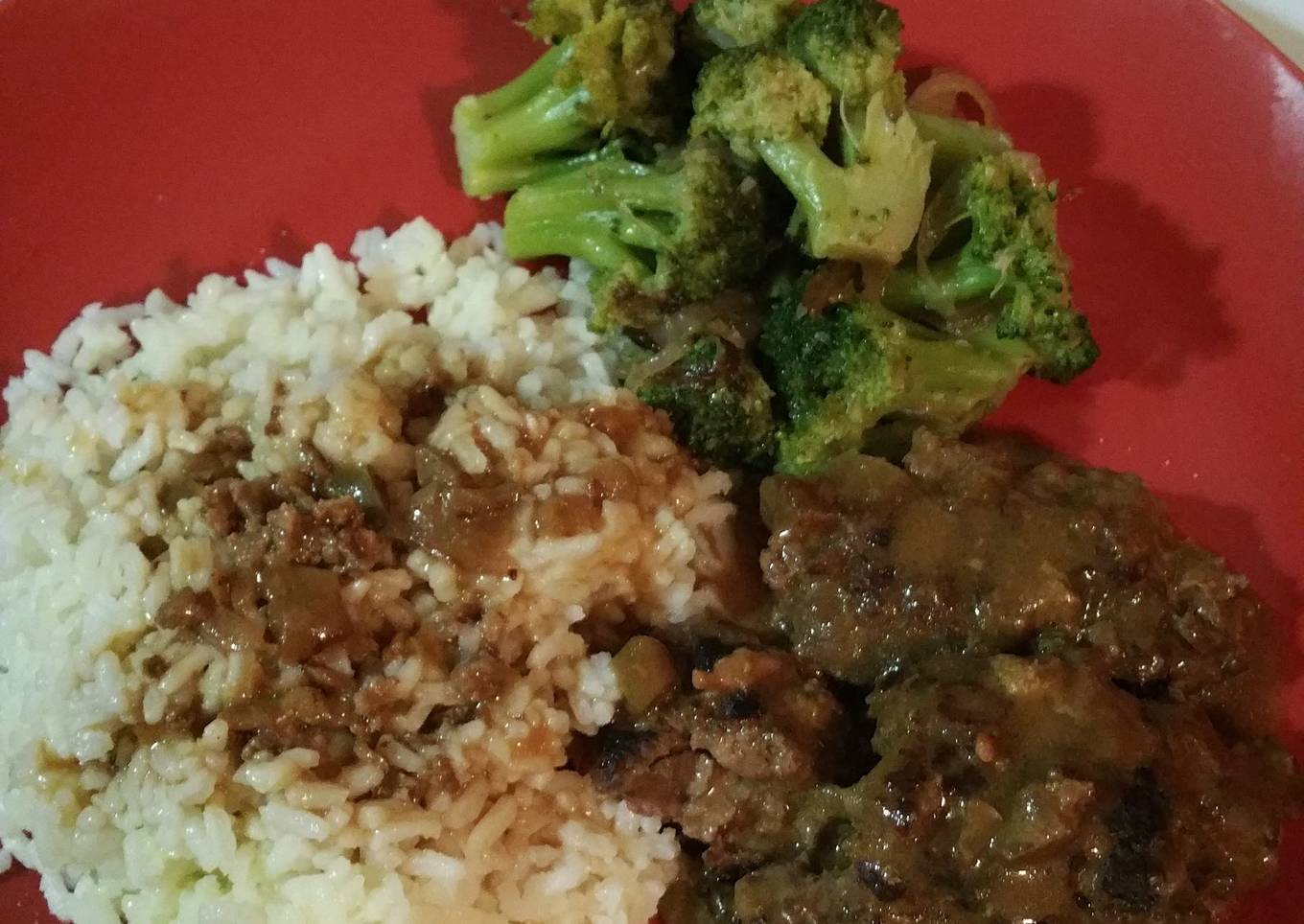 - Add onions to pan saute' until translucent then add flour and wisk for a minute, wisk in beef Broth add patties back in cover and let simmer until cooked thru. Serve along side white rice or mashed potatoes...ENJOY!!!
